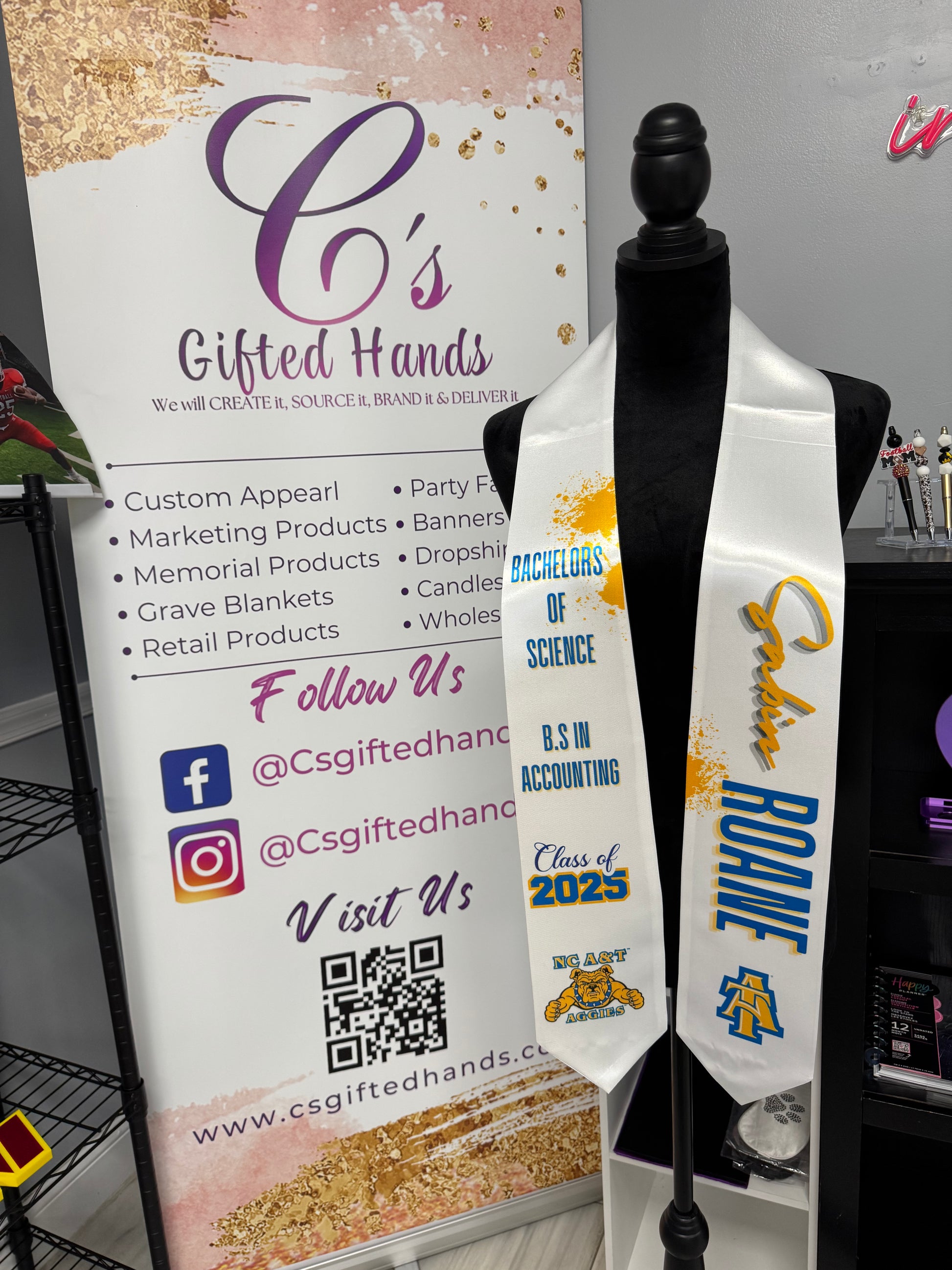 Custom graduation stoles...These custom graduation stoles are the perfect accessory for your special day. Made specifically for graduations, these stoles add a personalized touch to your graduation attire. With a stylish and professional look, these stoles are a must-have for any graduate. Made to order for a perfect fit.
