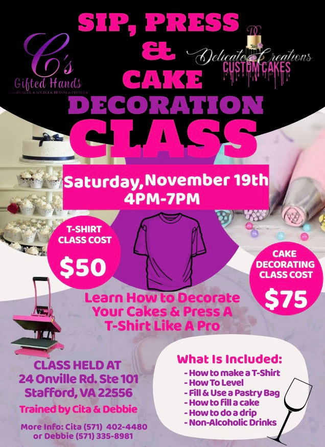 This is an in-person Sip Press & Cake Decorating Class where you will learn how to press your own shirts and you will learn how to decorate an eight-inch cake. All materials and supplies are included, and you will be taking home 2 designed t-shirts and a fully decorated 8-inch cake all created by you.